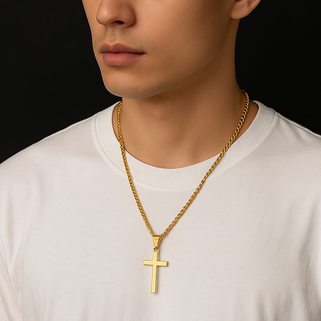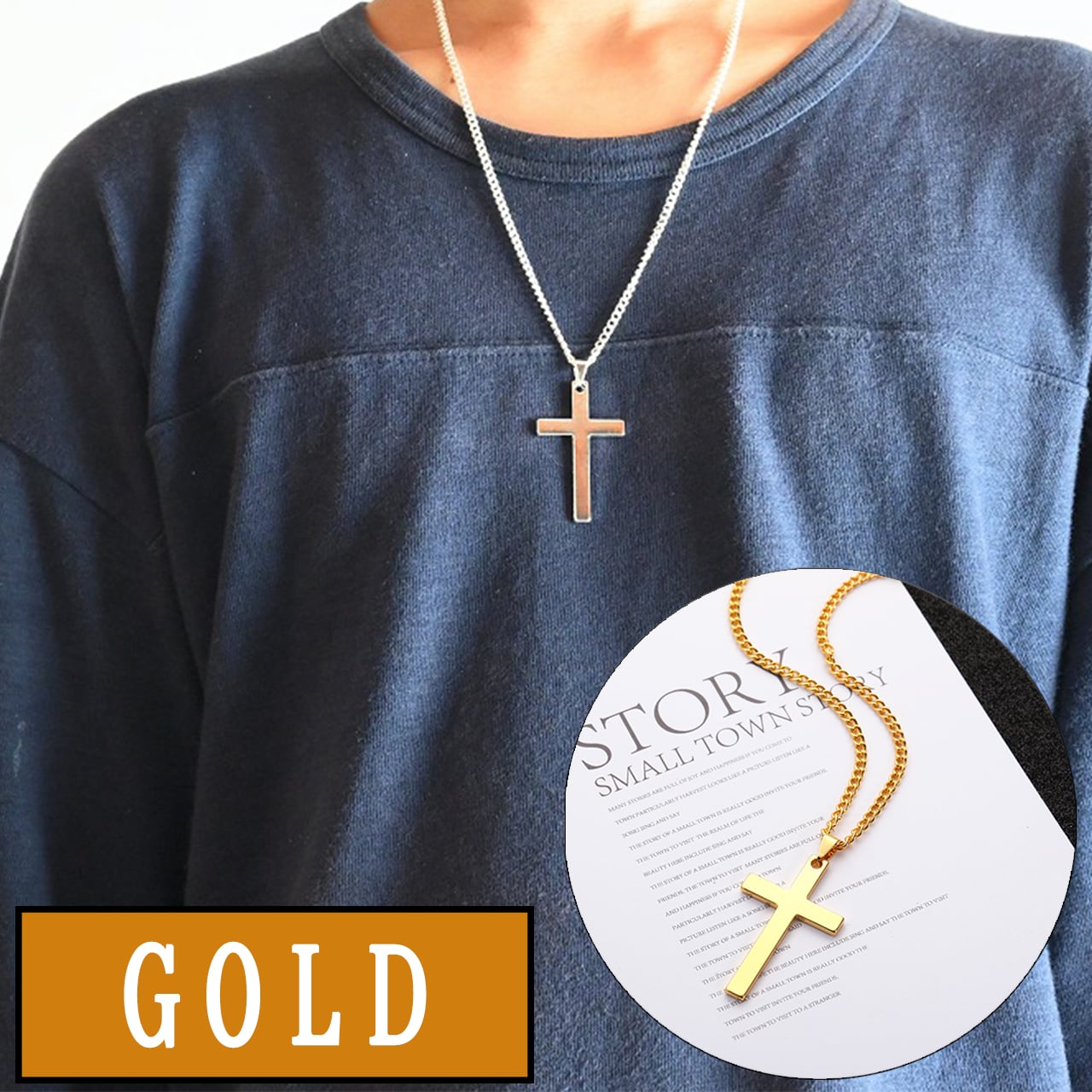 シンプルクロスネックレス メンズ ステンレス製 十字架ペンダント 60cmチェーン付き 3色展開 ブラック シルバー ゴールド 金属アレルギー対応 ステンレス